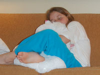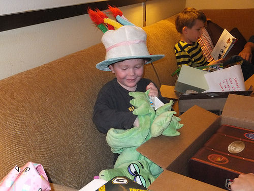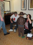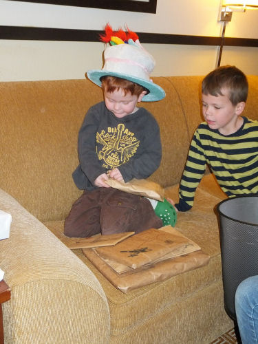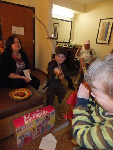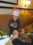 Eating....Tessa with her hands in her pockets....Our guests Bridget and Pat....A ton of gifts