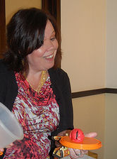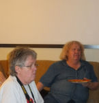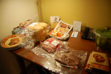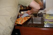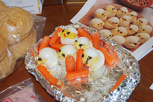 Our buffet....Jeff cuts Laura's veggie pizza....Kathy's deviled eggs and the picture of what they should look like