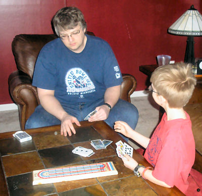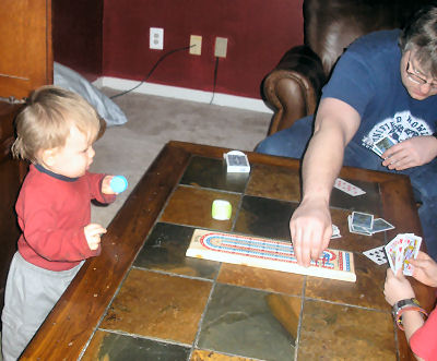 Playing cribbage.....Brendan wants to play too.....He plays with Aunt Becky's stool.