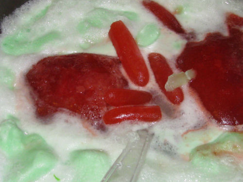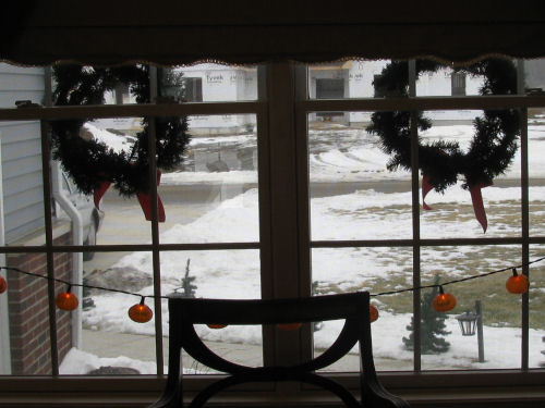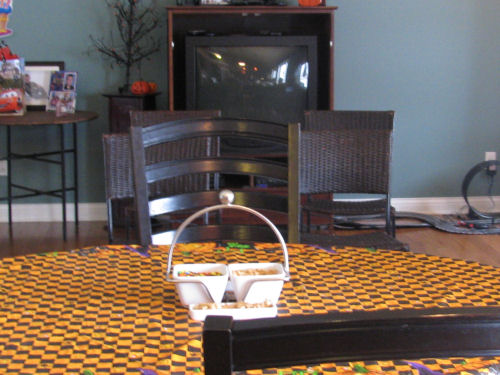 Jean's red hands in green punch....Halloween decorations....Placemats from Amy....Halloween inside and Christmas outside