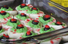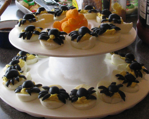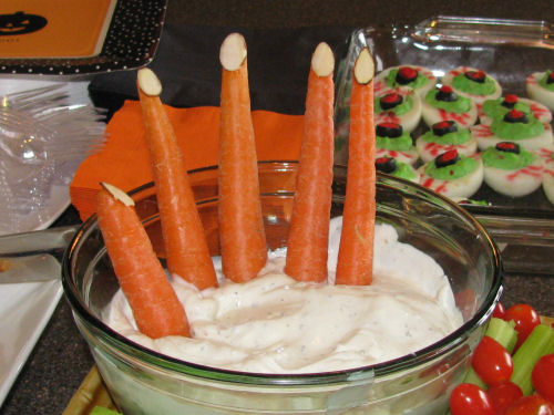 Jean asked me to bring "Scary" deviled eggs. I came up with spiders (which Becky assembled) and eye balls--Laura made scary veggies