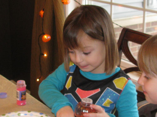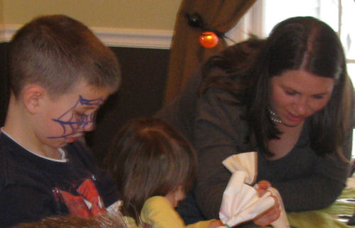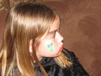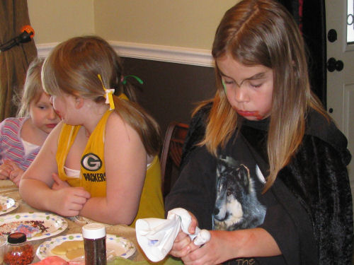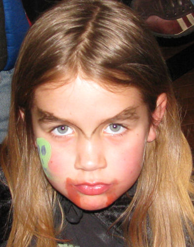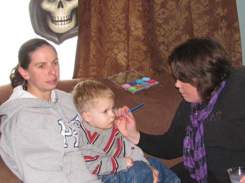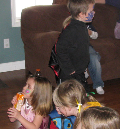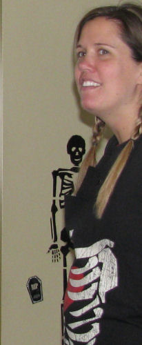 Playing a game....Daphne's ghost on her face....Pin the bone on the skelton