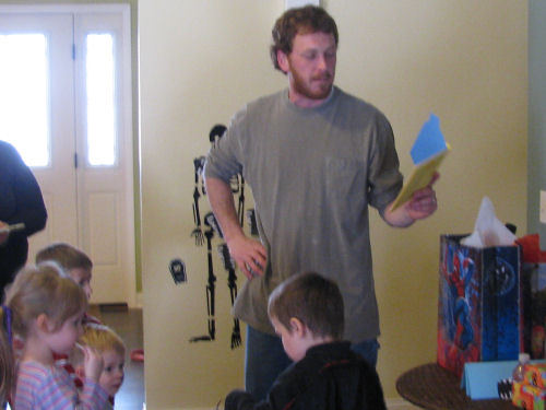 Jeff helps Brendan open his gifts and read his Birthday cards