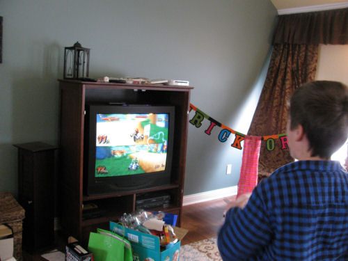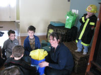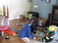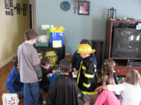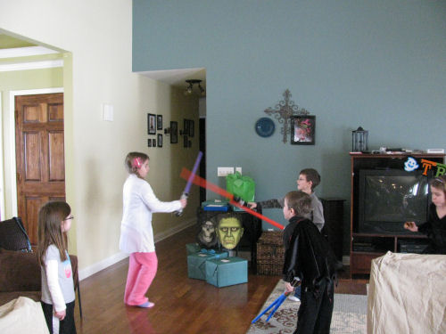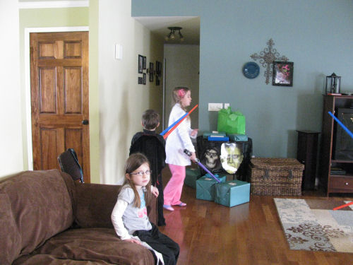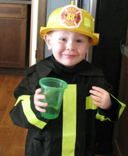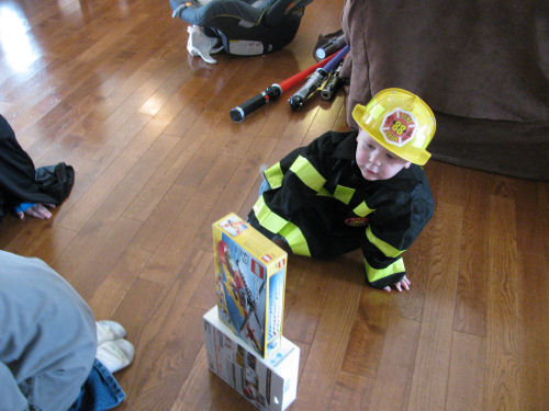 Owen as a fireman (It was a Halloween themed party)....Playing with light sabers