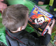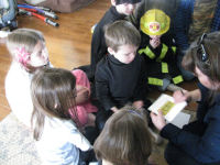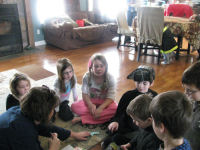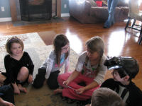 Opening gifts....Erin, Ally, Daphne (reading Brendan's card) and Josh....Owen checks out the new toys
