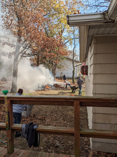 Everyone worked for about three hours and got all of my leaves raked and burned!