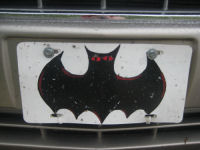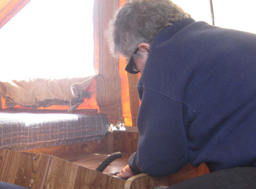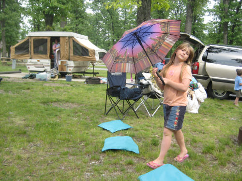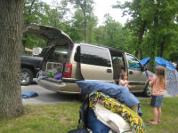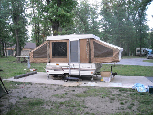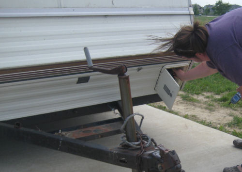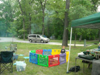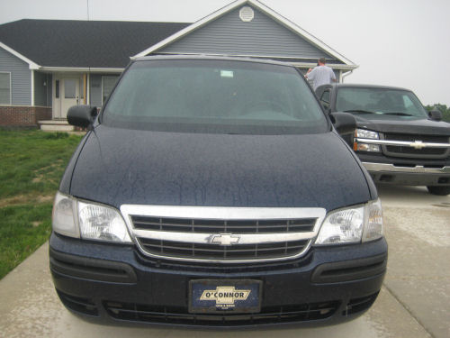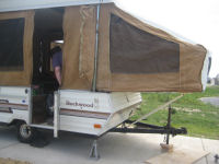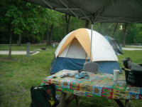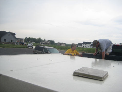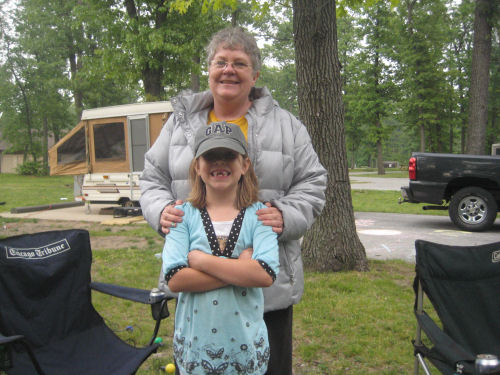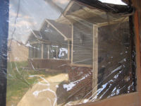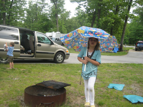 View of the Lahm Home from inside the camper...Kathy and Jeff...The front plate of the Bat Van...Rain