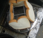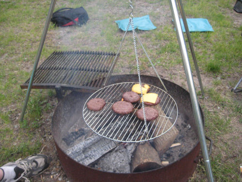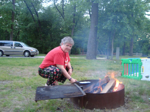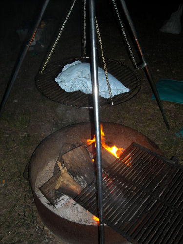 Kathy put a warmie (a cloth bag of rice) on the grill to heat up.