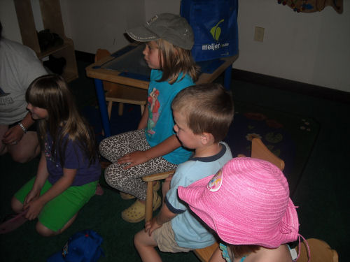 Jean, Hannah, Daphne, Brendan and Erin watch a puppet show.