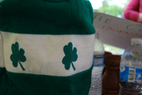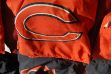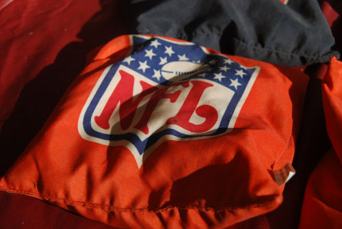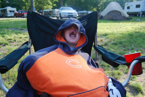 Brendan was cold in the morning so he snuggled up in Grandma Kathy's Bears hoodie (that was a gift from Pat)