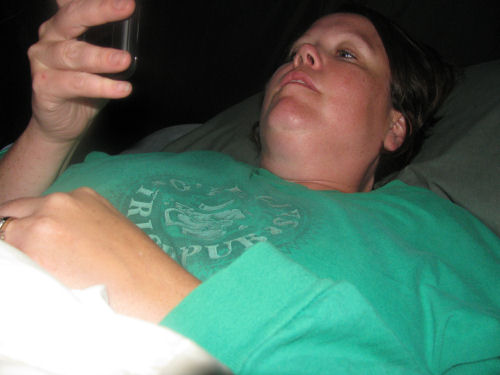 Jean texting while in bed....We played Bananagrams....The glow sticks in the morning