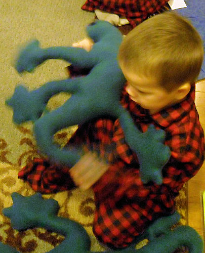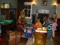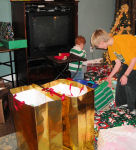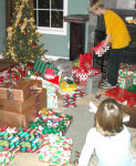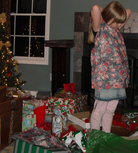 Terry got a fish sprinkler....Daphne and her necklaces from Aunt Mary....Erin....Owen hauling around his and Brendan's gifts from Aunt Mary