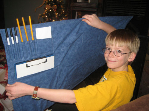 Alex got an organizer for the side of his bed (He helped Grandma Kathy design it)....Hannah got a scrap booking apron and matching scrap booking purse