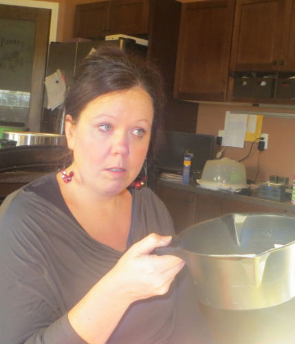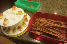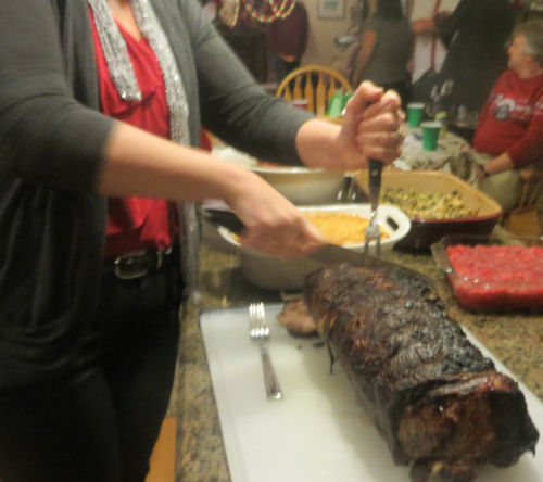 Cake....Kathy's deviled eggs with bacon and her bacon dribbled with chocolate....Alissa enjoying the bacon....Jean slicing the prime rib from Jim