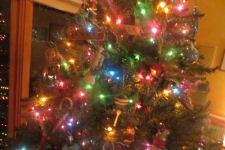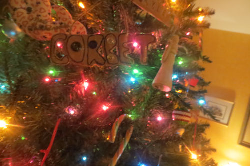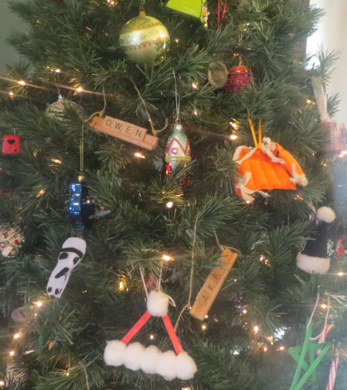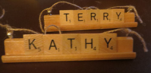 Kathy's gift this year: Scrabble name ornaments....Close-up of Jim's tree