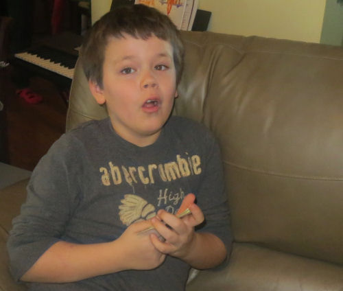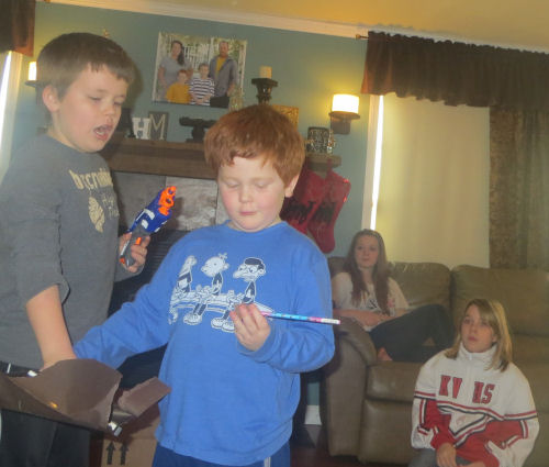 Opening gifts.....Owen checking out his first of the many "Pencils of the Month" he will received from Aunt Becky