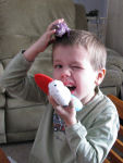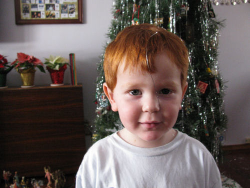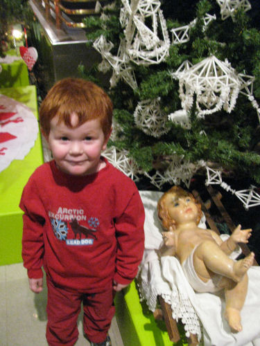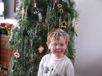 Brendan poses with some of his toys....One strand of tinsel is adorable....Then a whole bunch....Owen put Baby Jesus on the tree and it took us a while to find Him