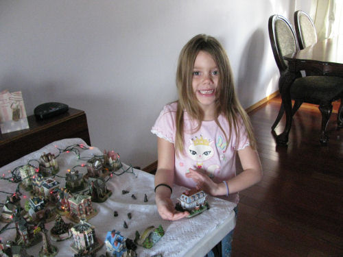 Our deck lights covered with snow....Tessa learns Grandpa Terry will babysit her while Grandma Kathy gets a haircut....Erin plays with the Village