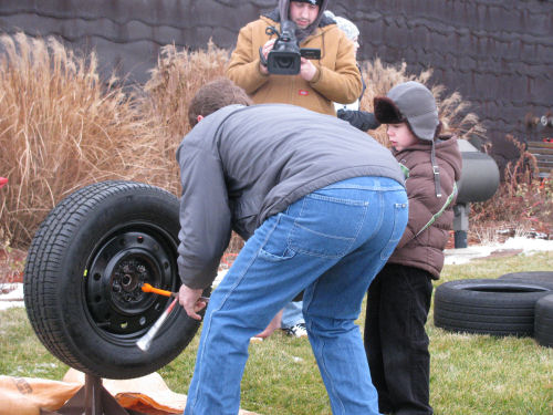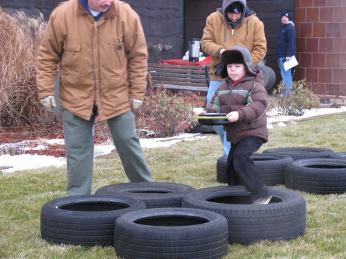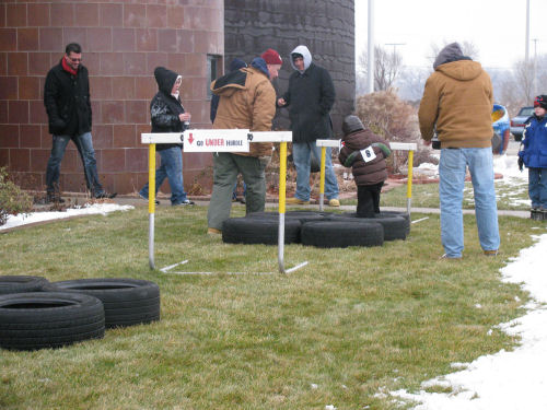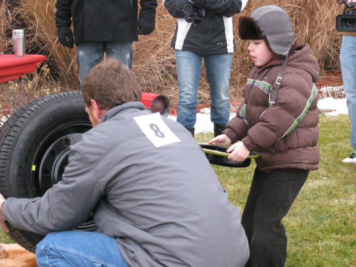 The parent/child teams "change a tire" and run through an obstacle course while holding a hubcap filled with lug nuts steady.