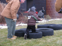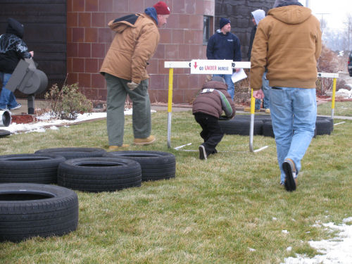 Brendan on the obstacle course....he didn't drop any lugnuts!