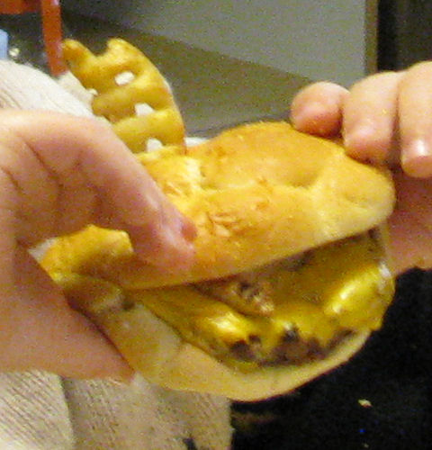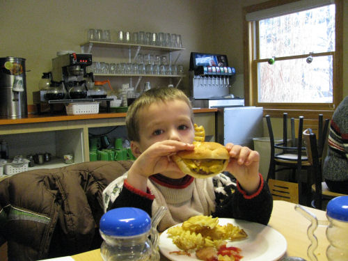 Tate's Place was a great restaurant....We think it might have been a church....Brendan's first time eating waffle fries....So he put some in his hamburger and one on top of it!