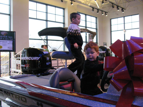 Our redhead....Kathy and Brendan check out the big tree....Jeff moves the boys from boat to boat to atv to atv and they love it.