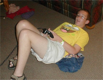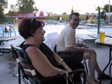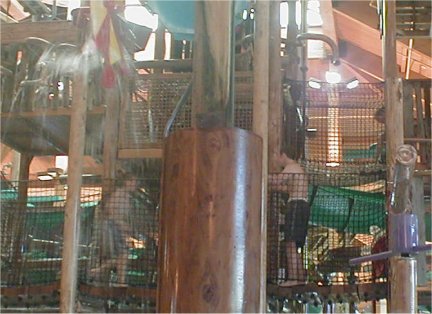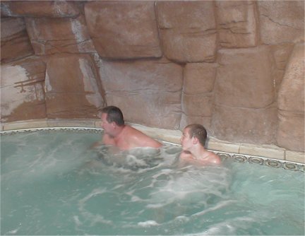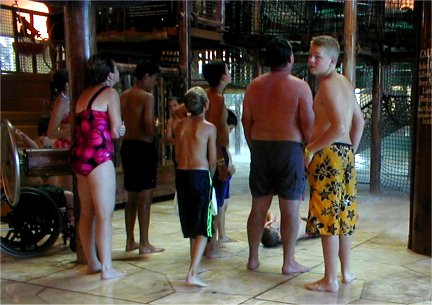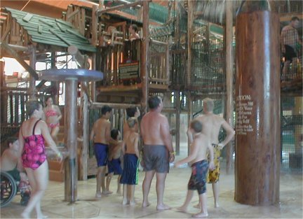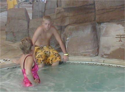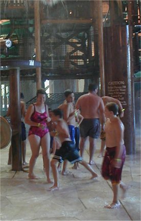 Playing in the pools. Notice Michael is laying down when the water falls from the bucket!