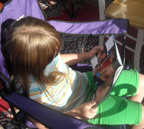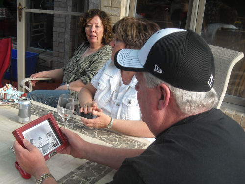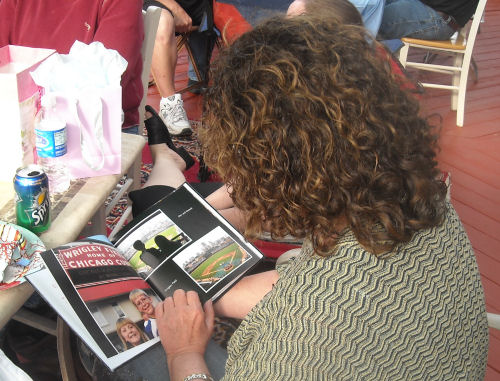 Colleen checking out the Cubs book....Jim, Sue and Terry....Aunt Mary
