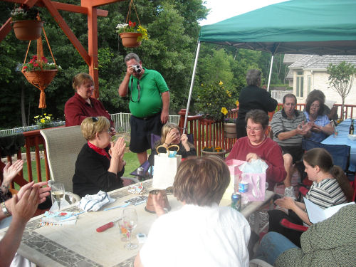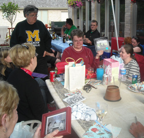 Trish, Sue, Cherie, Kathy, Mike, Jim, Joe, Eileen and Carrie....Jim taking pictures....Eileen reacting to the party and gifts