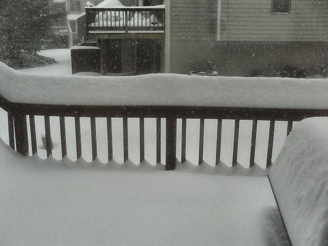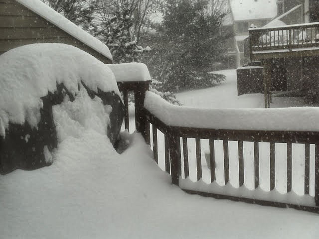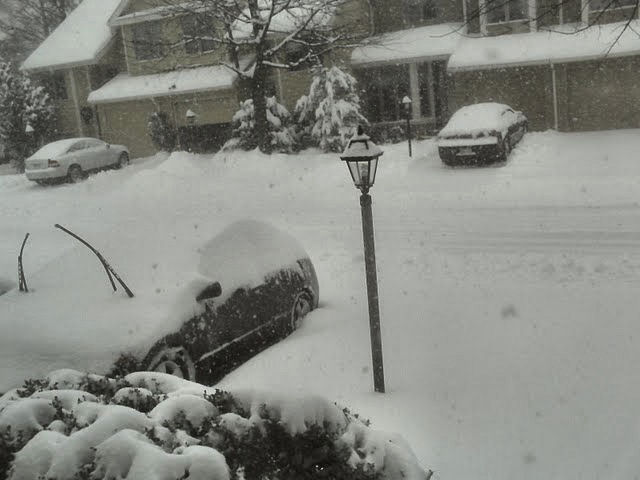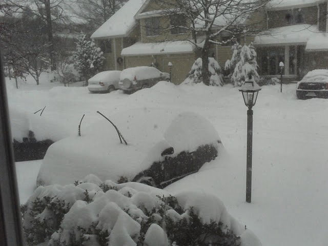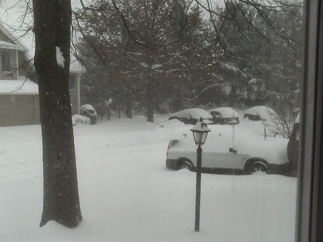 It's falling steadily here. Looks like we're up to maybe 4 inches with 10-20 left to go over the next 24 hours. The stores were madhouses yesterday, even at 3 pm. It's supposed to be pretty bad. Chris went and got all of the necessary essentials yesterday (i.e. food & beer) so we're ready. We all have tickets to the Ravens/Bears game tomorrow and they moved the time from 1:00 pm to 4:15 pm to give everyone more time to dig out. We'll see! Right now it's a good excuse to clean the house today!