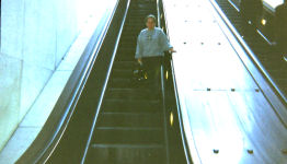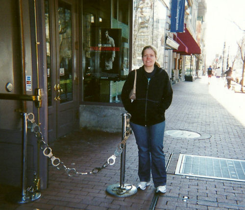 Cherie outside the Crime and Punishment Museum. Note the chain-linked handcuffs.