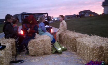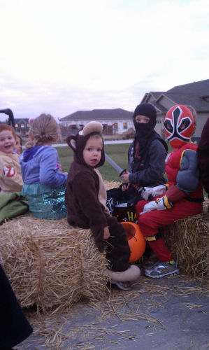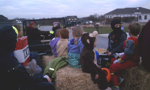 THIS is how to trick-or-treat....On a hayride with the neighbors!