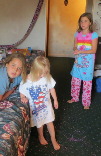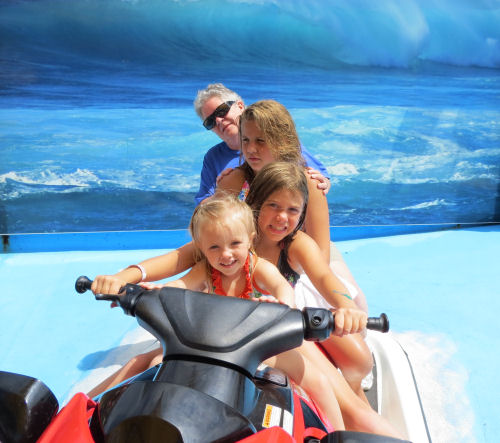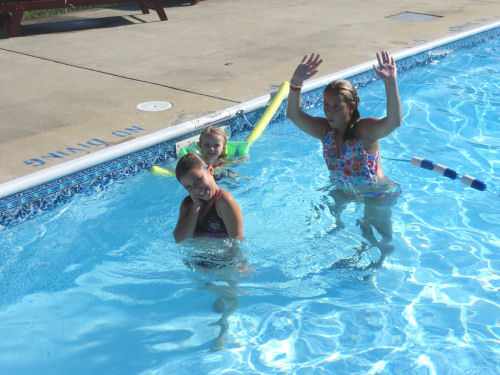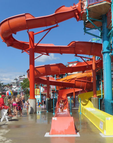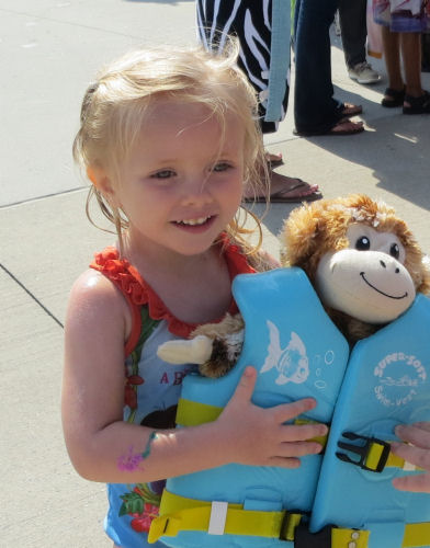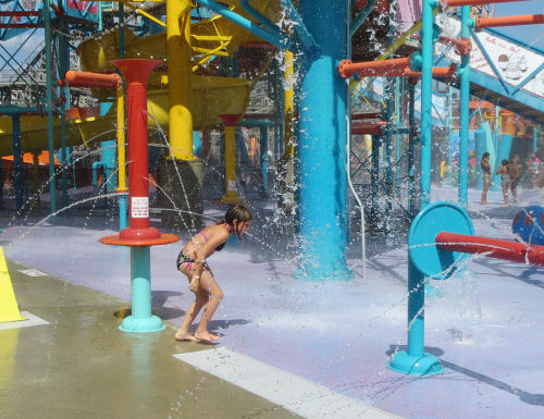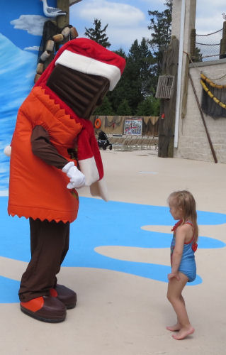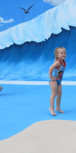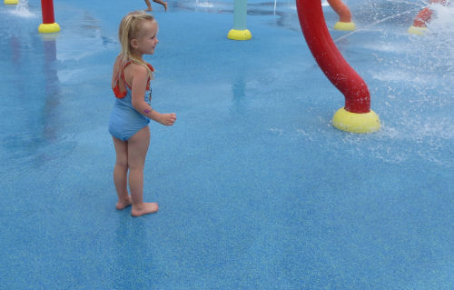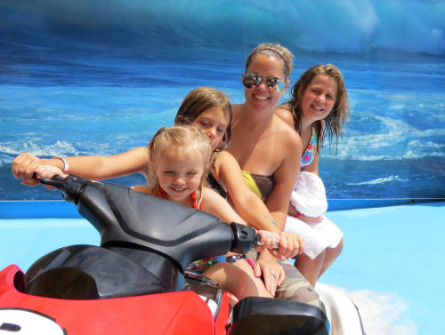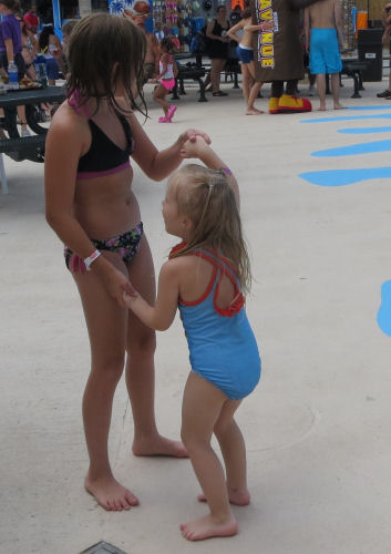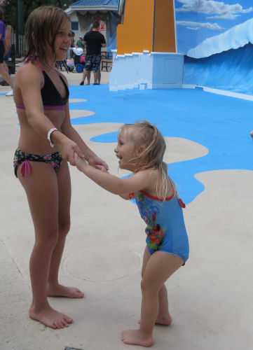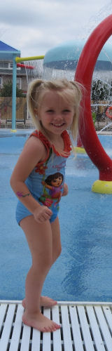 All three in the big pool....Daphne coming down the orange slide....Erin in the water sprays....Tessa gives her life jacket to her monkey