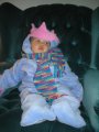 Daphne is wondering why she is in a snowsuit with a crown on it!