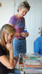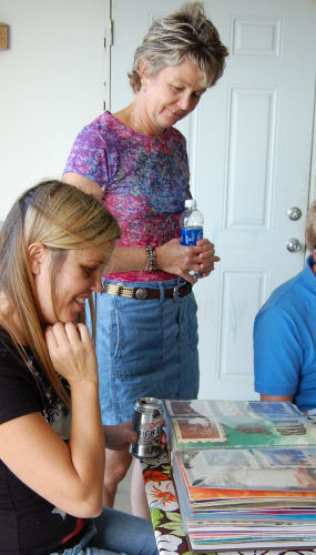Laura, Sue, Michael and Sean look at Kathy's scrapbook (from Becky)....Laura, Sue and the scrapbook....Sue and Sean look at the mini scrapbook from Becky