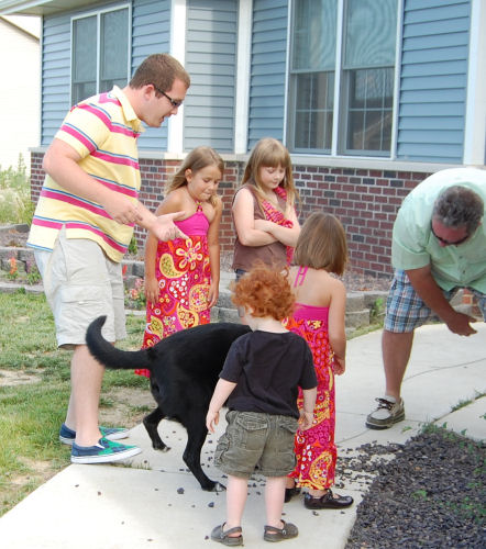 Kyle, Daphne, Hannah, Owen, Erin and Jim watch Jack bark at a rock.