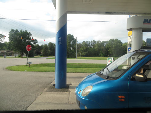 At our gas station, we saw a car with only three wheels....One in the front
