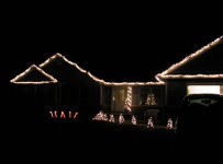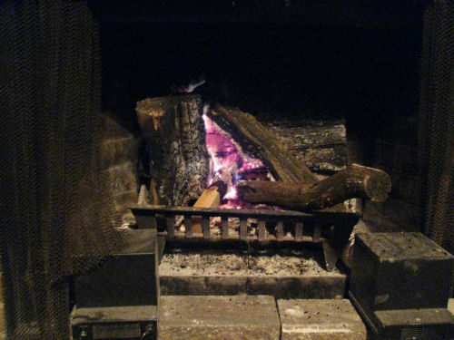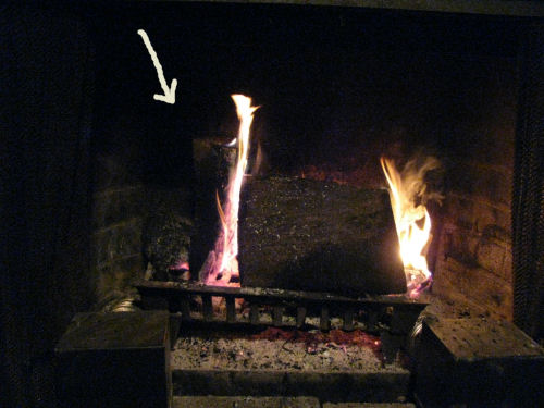 The decorated Lahm home....I built a fire to watch football...At one time only half of the fire was going....Later I noticed a vertical log!