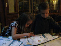Erin and Brendan color together....Daphne covered in sauce after sharing ribs with Grandma Kathy