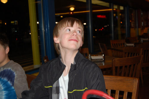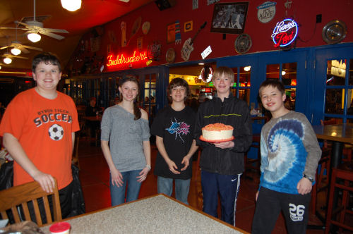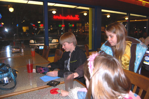 Alex opens a card from Grandma Kathy and Grandpa Terry....Alex looks to the stars....Hannah, Daphne and Erin sat at a tall table