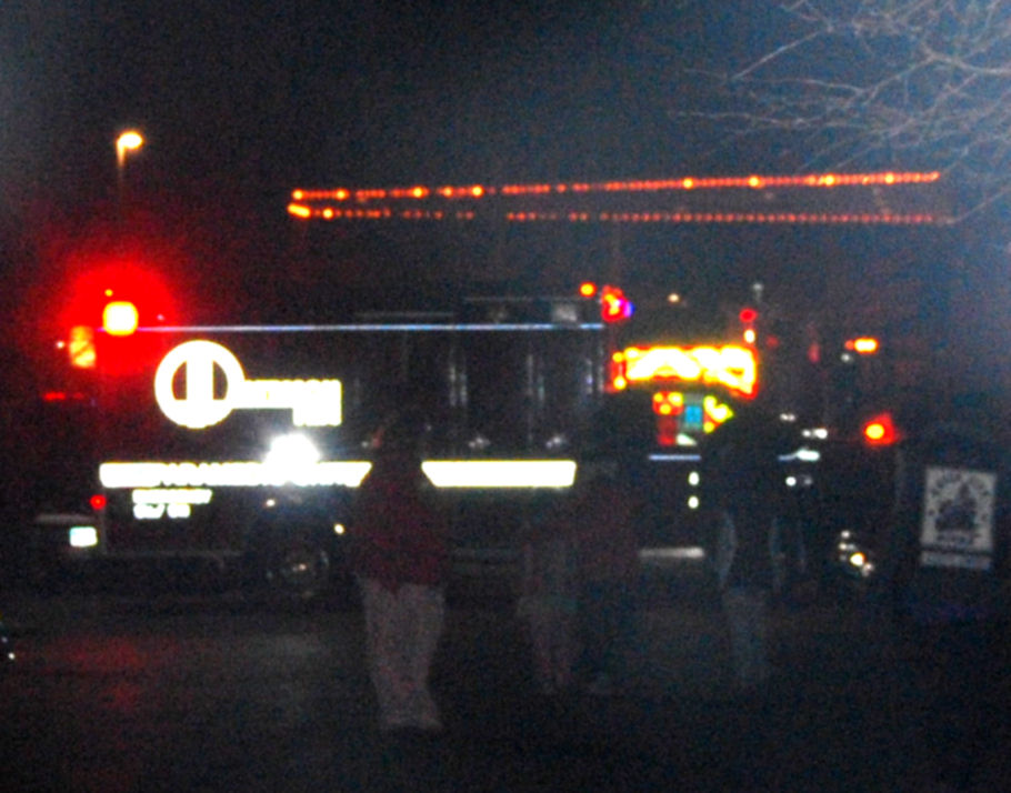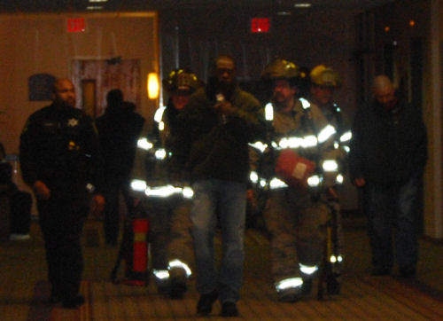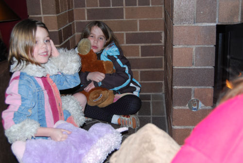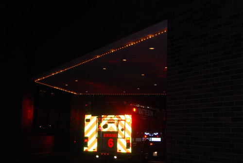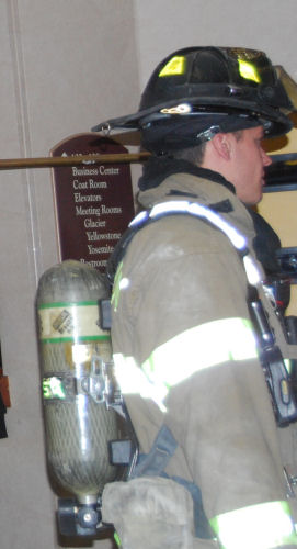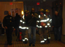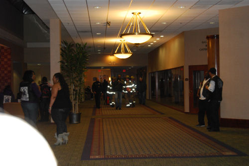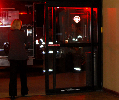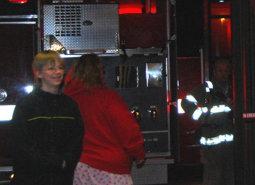 Becky and the girls walking to the front of the Hotel....Several fire trucks were there