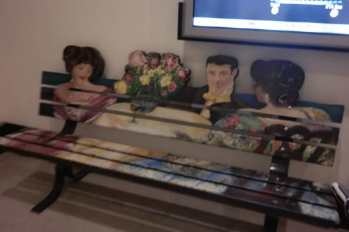 The Hulk....A cow sitting on a bench....Blue Herbie
