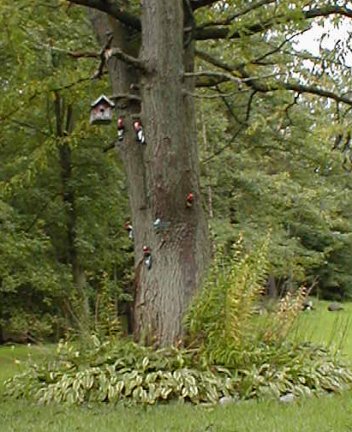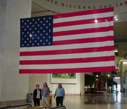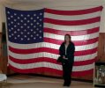 Jean posed with the flag and I took a picture of Jeff's relative's wooden woodpeckers.