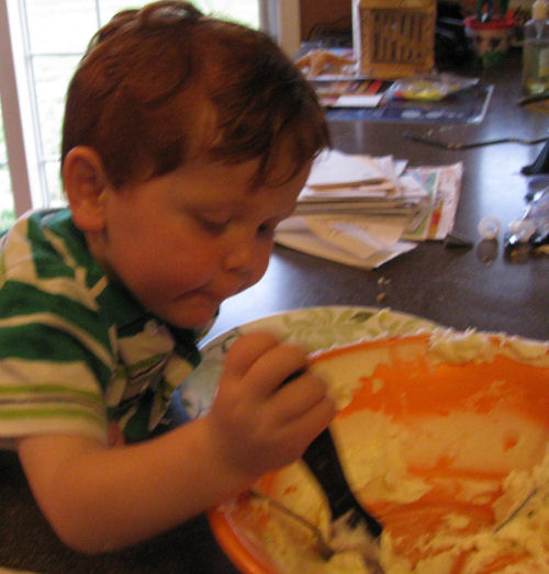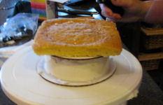 Jean working on Brendan's Graduation Hat cake....Owen likes cake
