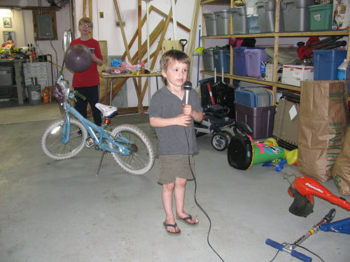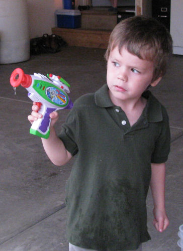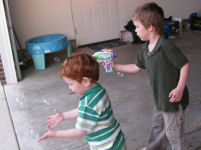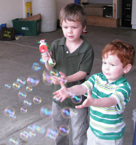 Brendan and Owen playing with the Bubble Gun from Grandpa Terry and Grandma Kathy