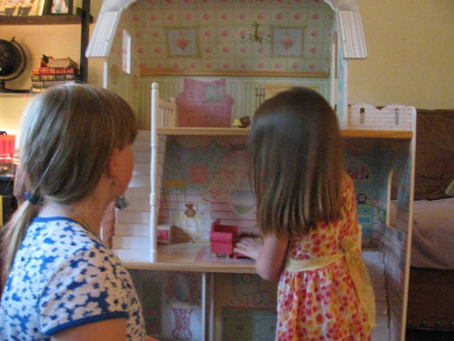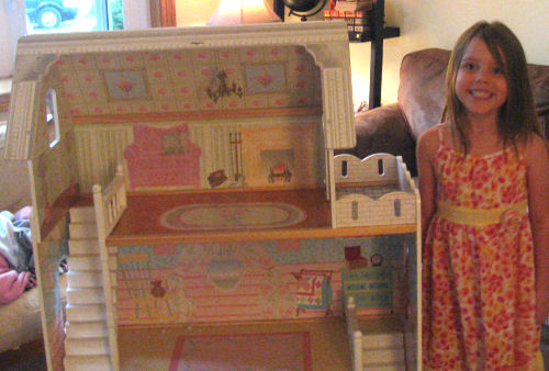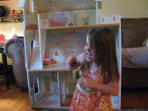 The Cake....Erin's surprise from Mommy and Daphne....The huge doll house....Hannah and Erin checking it out