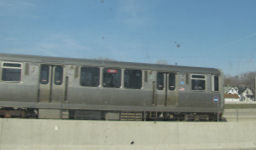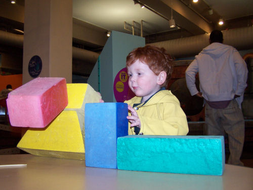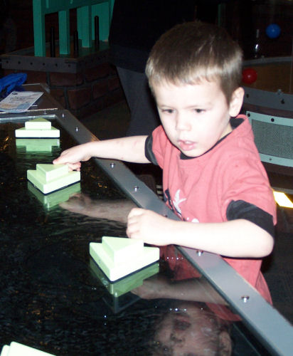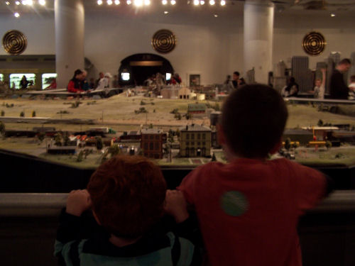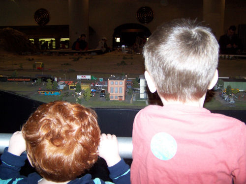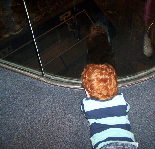Owen looking down at the trains....We brought our lunch and ate in the vending machine area of the Henry Crown Center