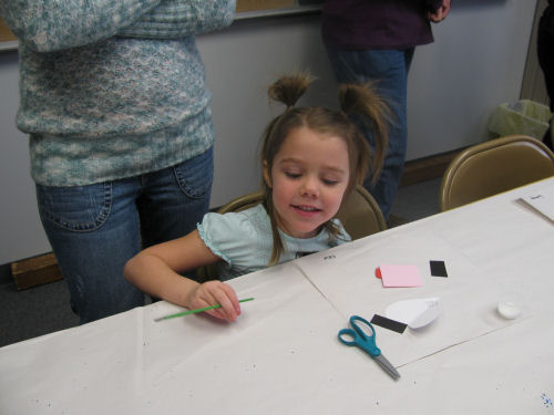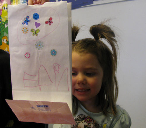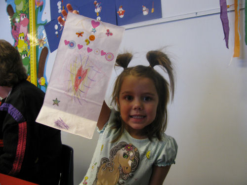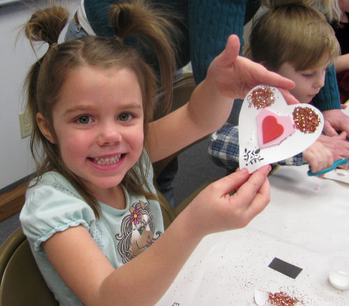 Erin making a valentine and decorating her valentine bag