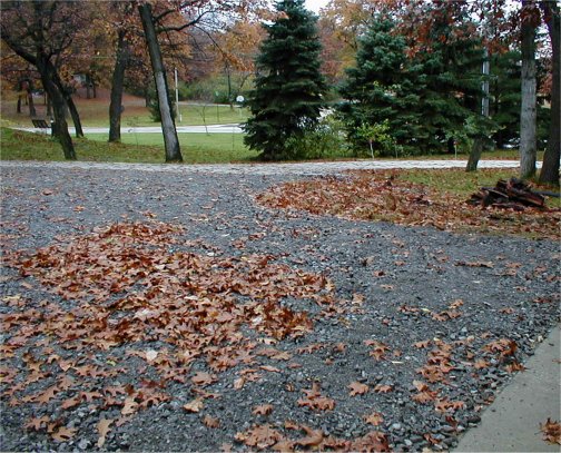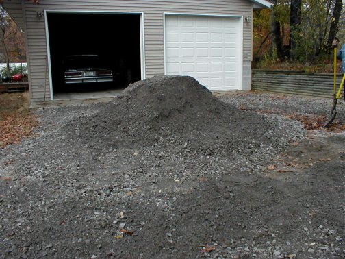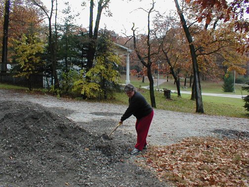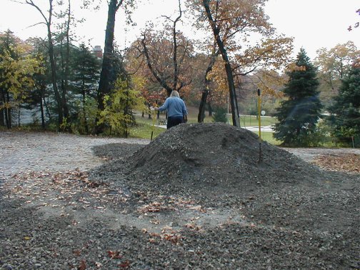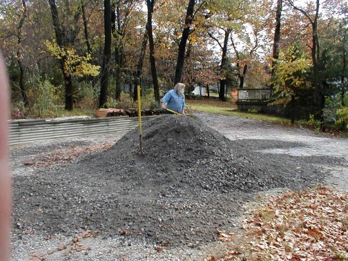 This is Terry's idea of a vacation. He had the week off so he ordered a load of gravel for the driveway. I helped him for about two hours. Not only was the gravel heavy and dirty, it also had the vague smell of tar. And then Terry started singing. Sixteen tons and what do you get? Another day older and deeper in debt..... Notice he also got a leaf in his hair. And at one point, the gravel looked like that sculpture from Close Encounters of the Third Kind. What a miserable way to spend an afternoon!