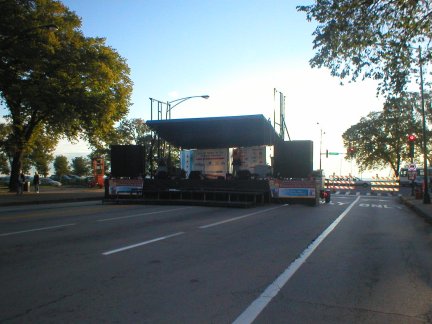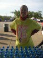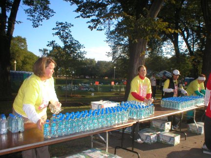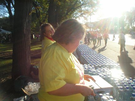 The bandstand....Jean, Laura and Kathy open cases and cases of Fiji water for the runners and walkers.